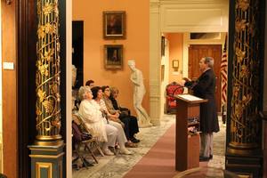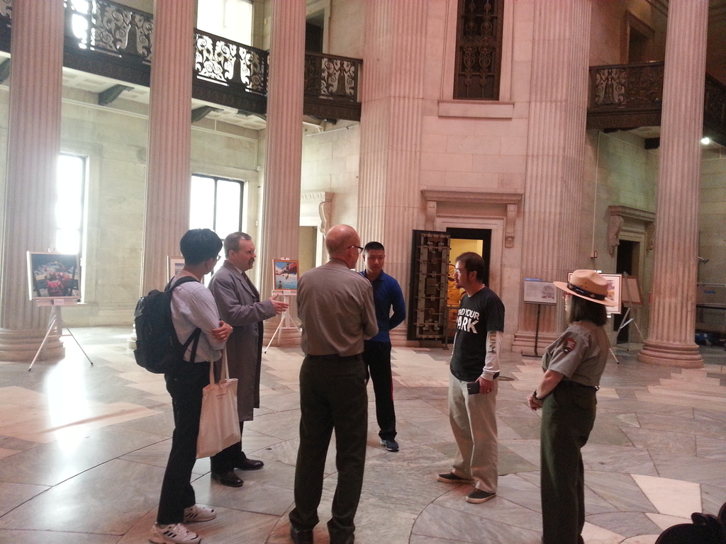 Speaking with visitors at Federal Hall, New York.